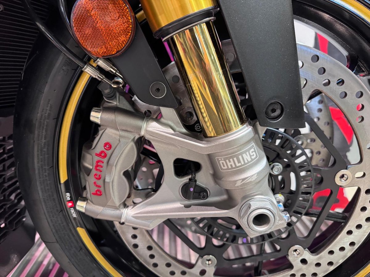• Front Brake Description: Twin disc; Brembo M50 monobloc radial calipers; Stainless steel braided hydraulic hoses; Switchable Bosch 9.1MP ABS