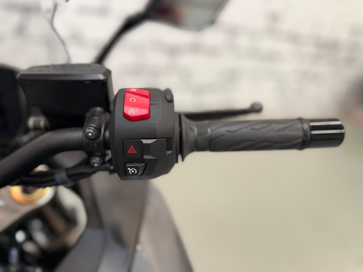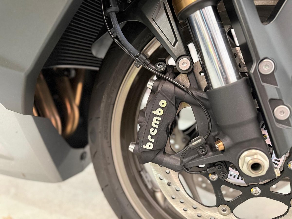 • Front Brake Description: Twin floating discs; Brembo monobloc radial opposed pistons calipers; Hydraulic; ABS
