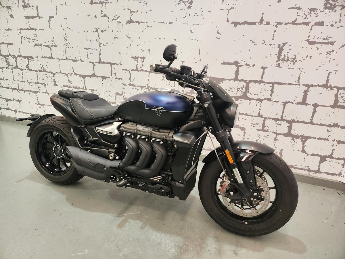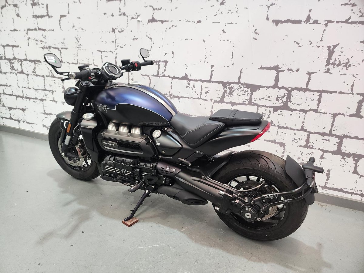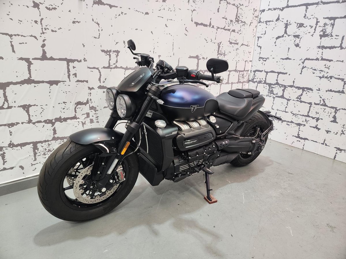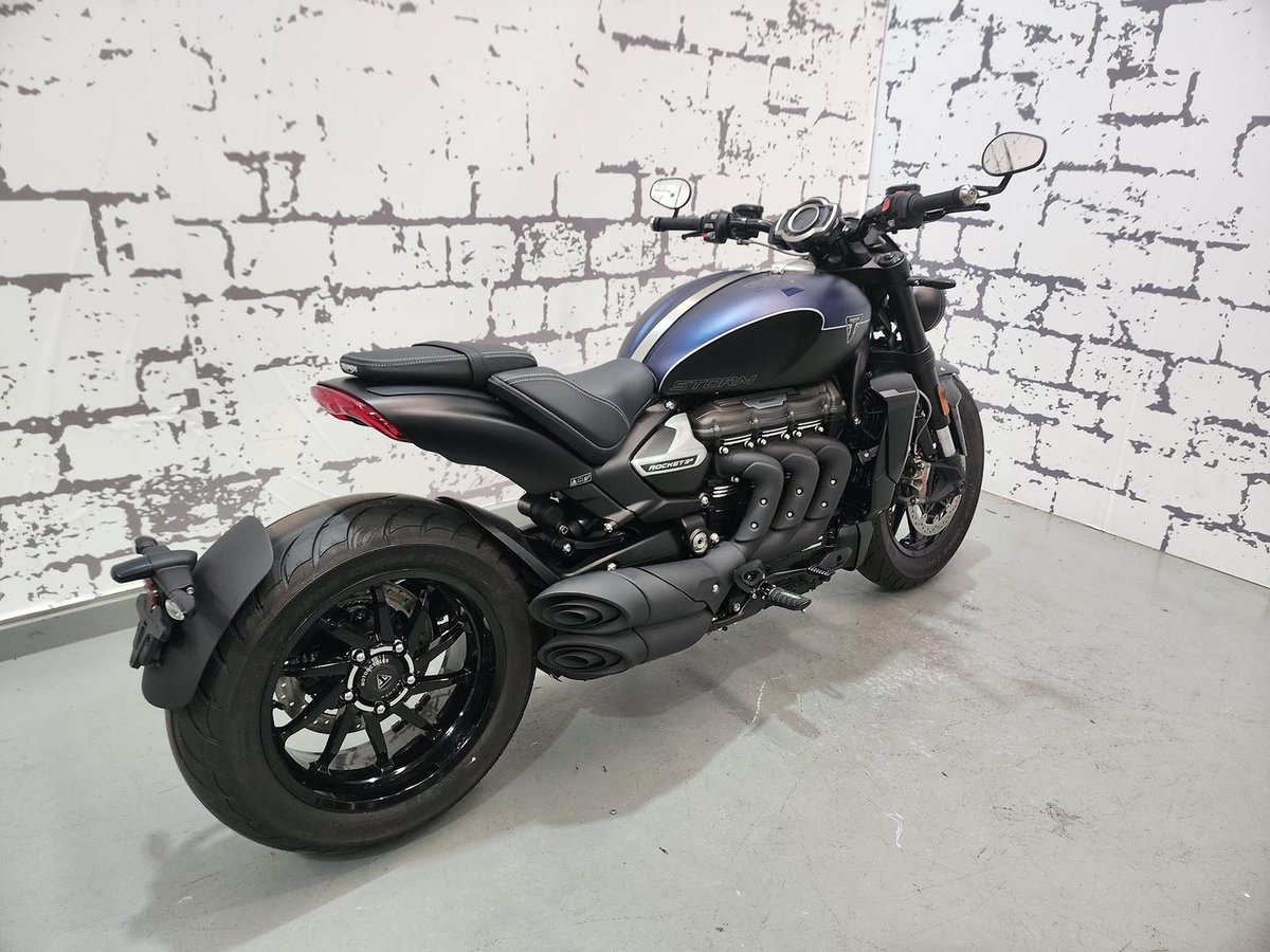 The **2025 Triumph Rocket 3 R Storm** is pure muscle on two wheels. Its massive **2,458cc triple engine** delivers brutal torque and thrilling acceleration that few bikes can match. Blacked-out styling, premium **Showa suspension**, and **Brembo Stylema brakes** give it both attitude and control. Despite its size, the lightweight aluminum frame keeps handling sharp and responsive. If you want a cruiser that dominates every road and turns heads everywhere, the Rocket 3 R Storm isn’t just transportation—it’s an experience you feel every time you twist the throttle.