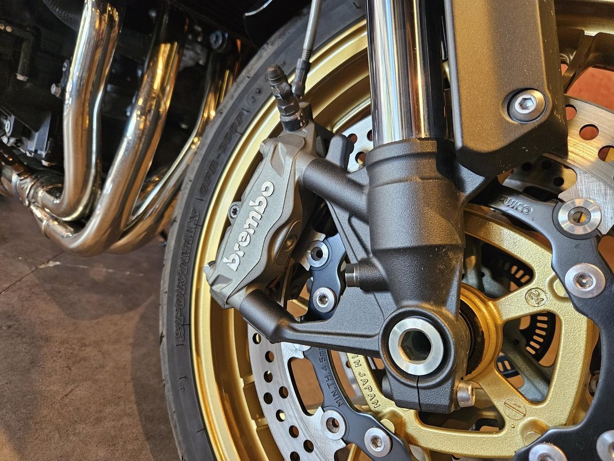 • Front Brake Description: Twin floating discs; Radial mount, opposed piston monobloc Brembo calipers; Hydraulic; Sintered pads; Nissin ABS